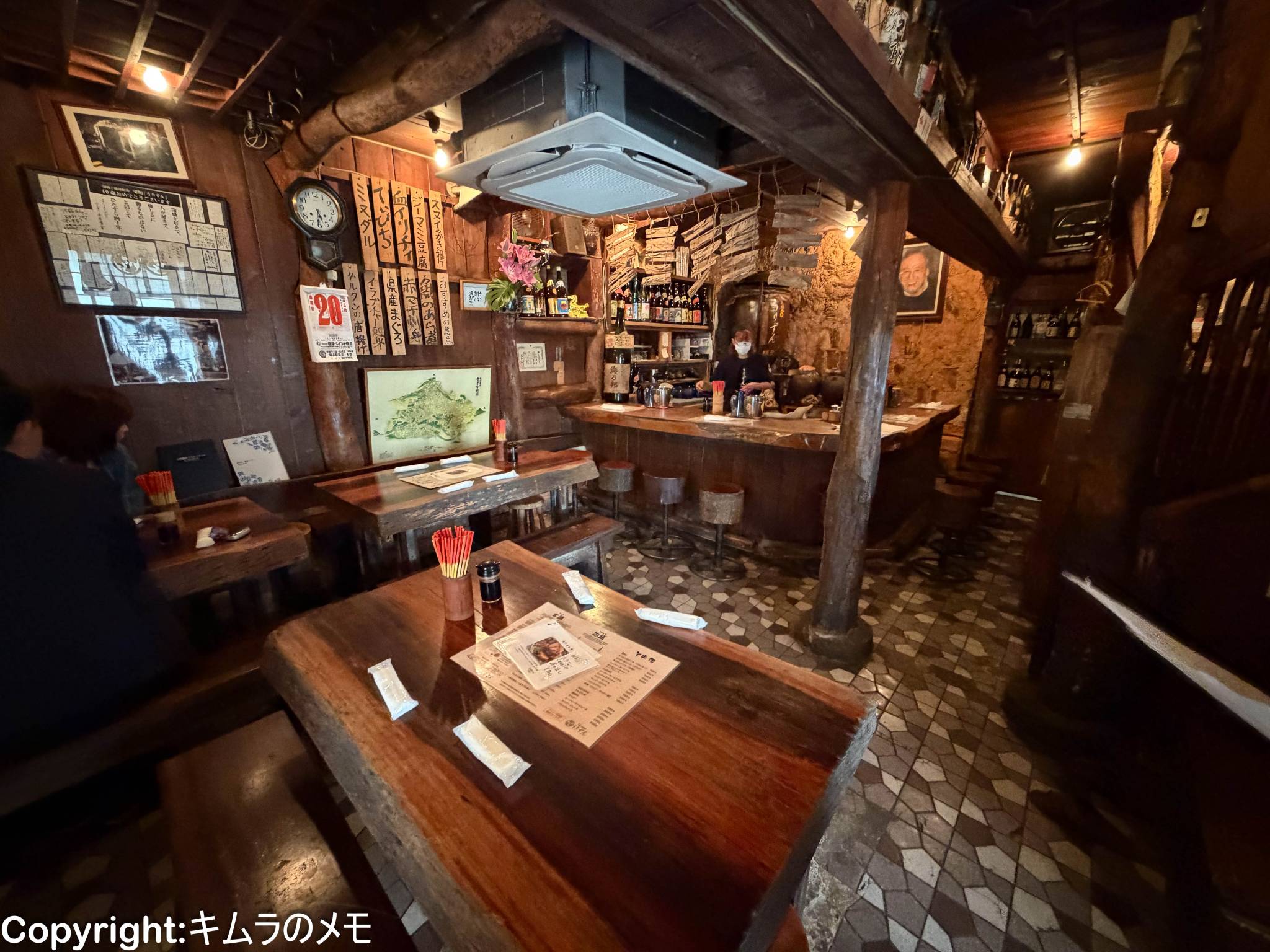 その店内は外観同様に雰囲気のある古民家となっており、泡盛が数多く陳列されているバーカウンターを囲むようにカウンター席が6席、4名掛けのテーブル席が3卓ある。