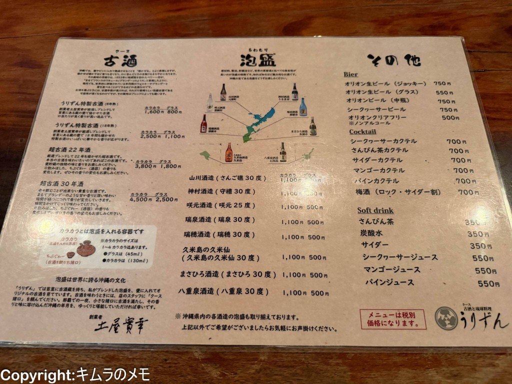 また飲み物も泡盛がメインで、その他にはビールやシークワーサーカクテルなどの沖縄を連想させるカクテルのみ。