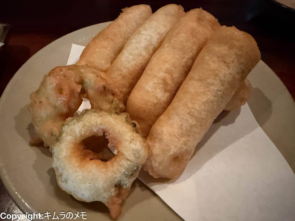 棒状に整えられた魚天ぷらが5本、そしてリング状のゴーヤ天ぷらが2つと、ボリュームはなかなか。
