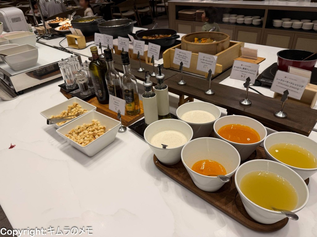 ドレッシングの他にオリーブオイルやバルサミコ酢なども用意されている。