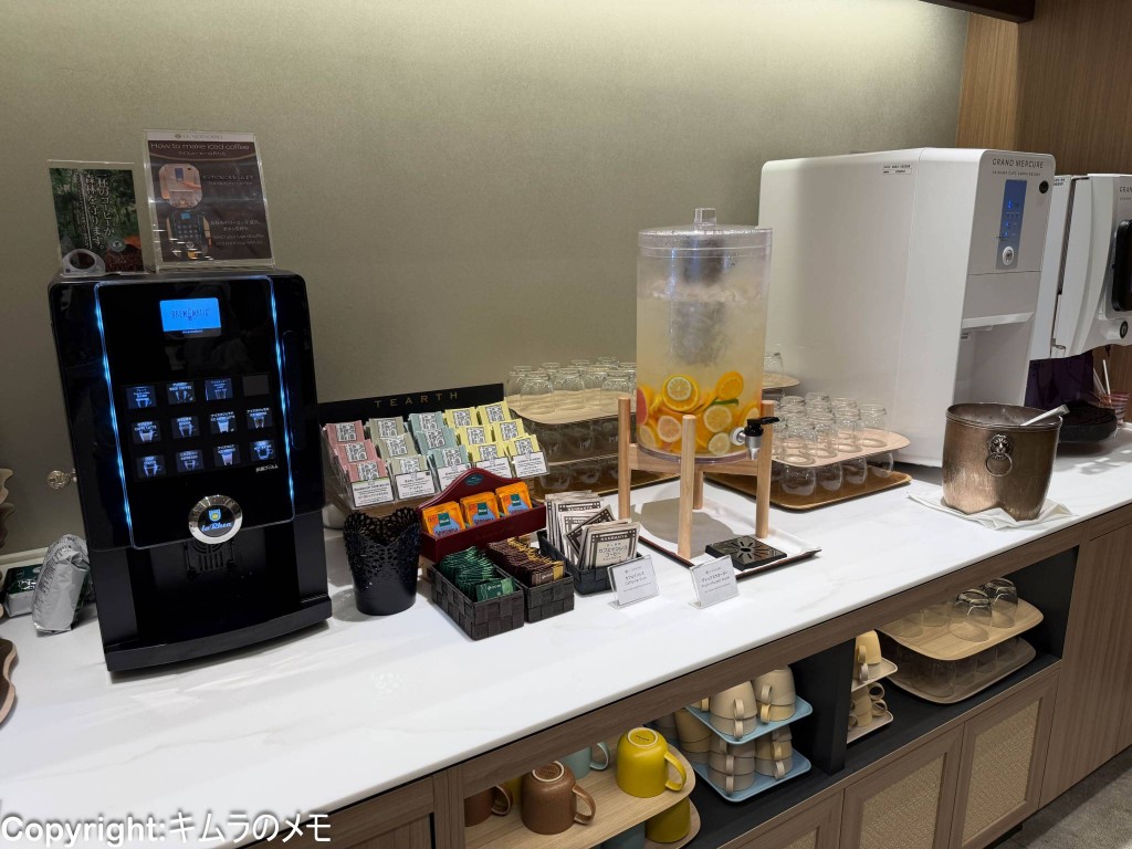 ドリンクコーナーではデトックスウォーターやジュース、そしてコーヒーマシンが用意されている。