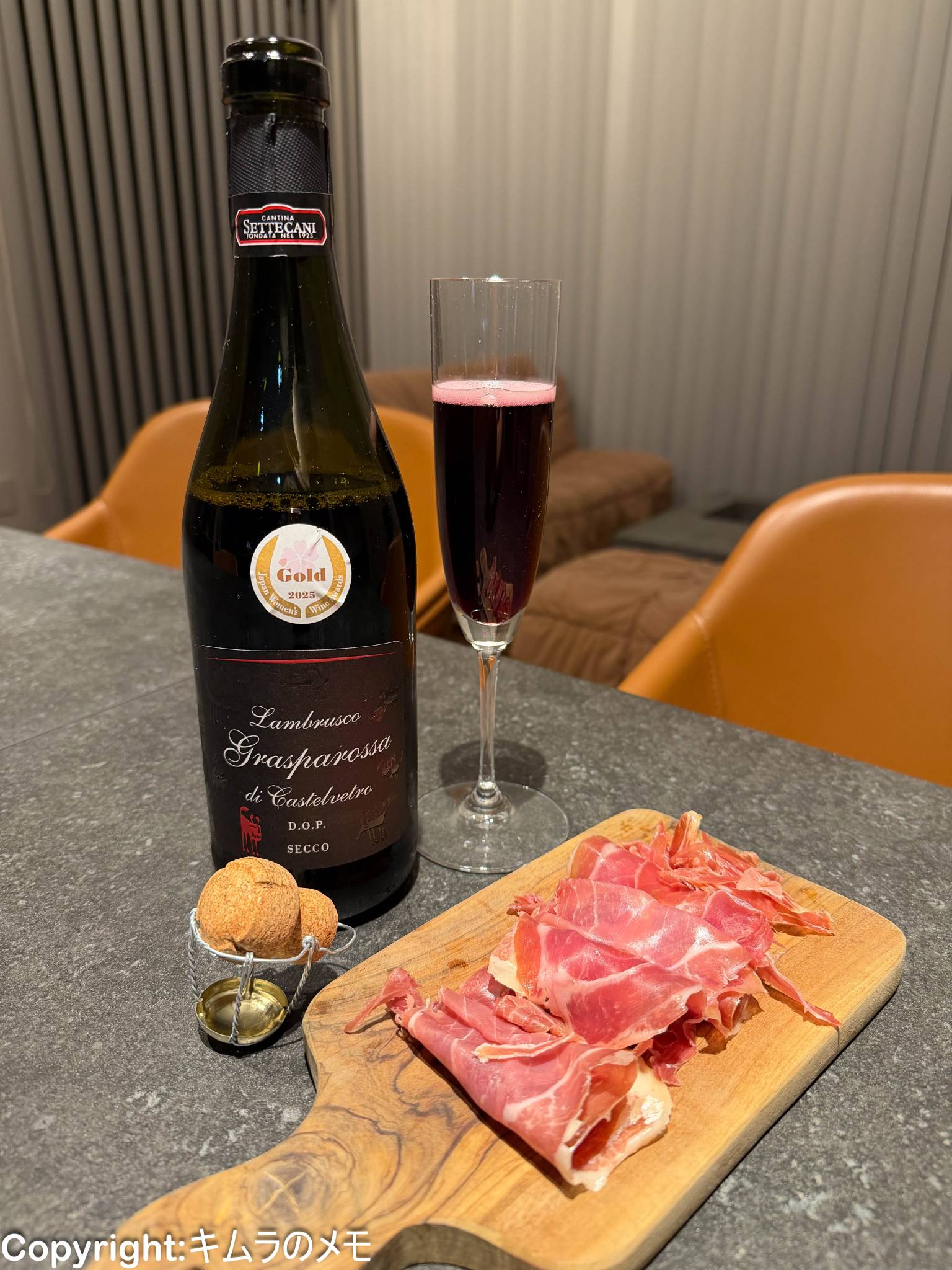 抜栓までランブルスコと気付かずに生ハムを合わせたのだが、しっかりと濃厚な味わいと程よい塩分のあるこちらの生ハムは、赤ブドウの芯のあるタンニンにも負けずにバランスを保つ。