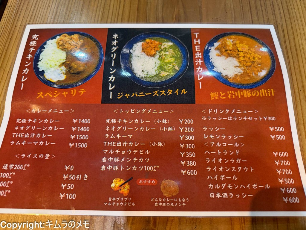 そのカレーだが、スペシャリテとして究極チキンカレー、その他にネオグリーンカレーとThe出汁カレーの計3種類がオススメメニューとして写真付きで紹介されており、その他にラムキーマカレーがあり、トータル4種類となっている。