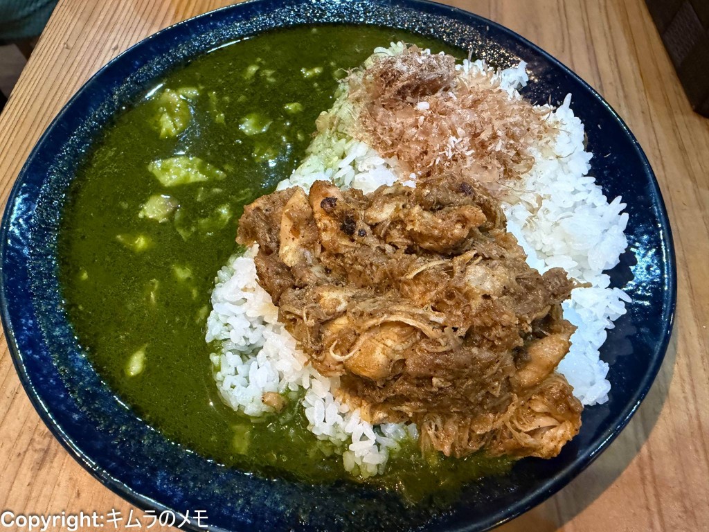 カレーはスープ状のもので、ご飯の上には鰹節とペースト状になったほぐした鶏肉がたっぷりと盛られての提供だが、提供と同時に鰹節の豊かな香りを感じるジャパニーズ感溢れるカレー。