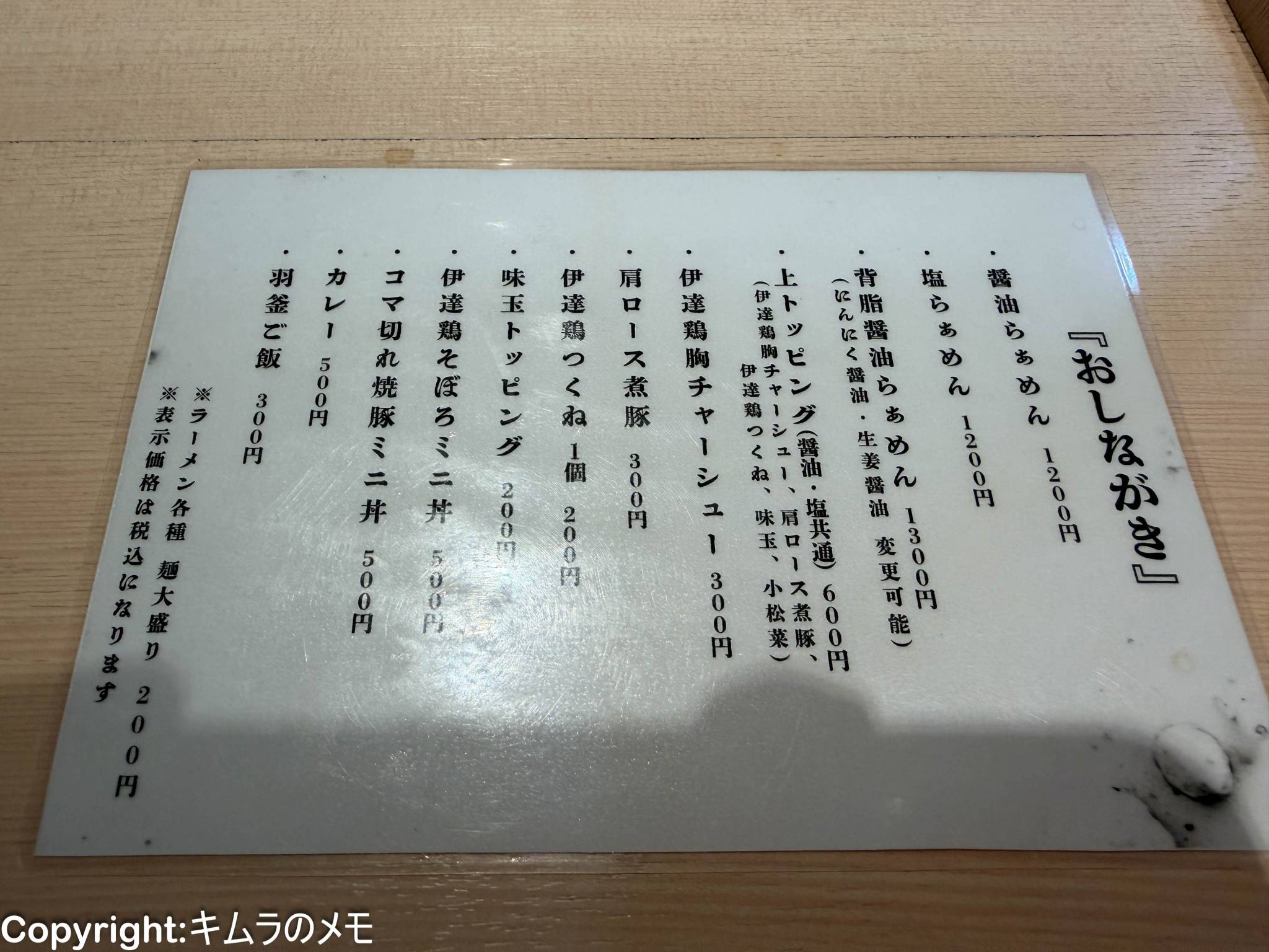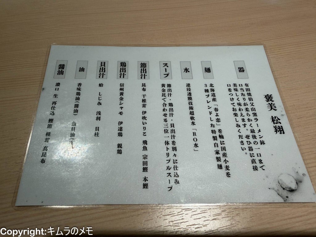 メニューの裏にはこちら店のラーメンへのこだわりが書いてあるので、提供までの間に目を通すのも良さそう。
