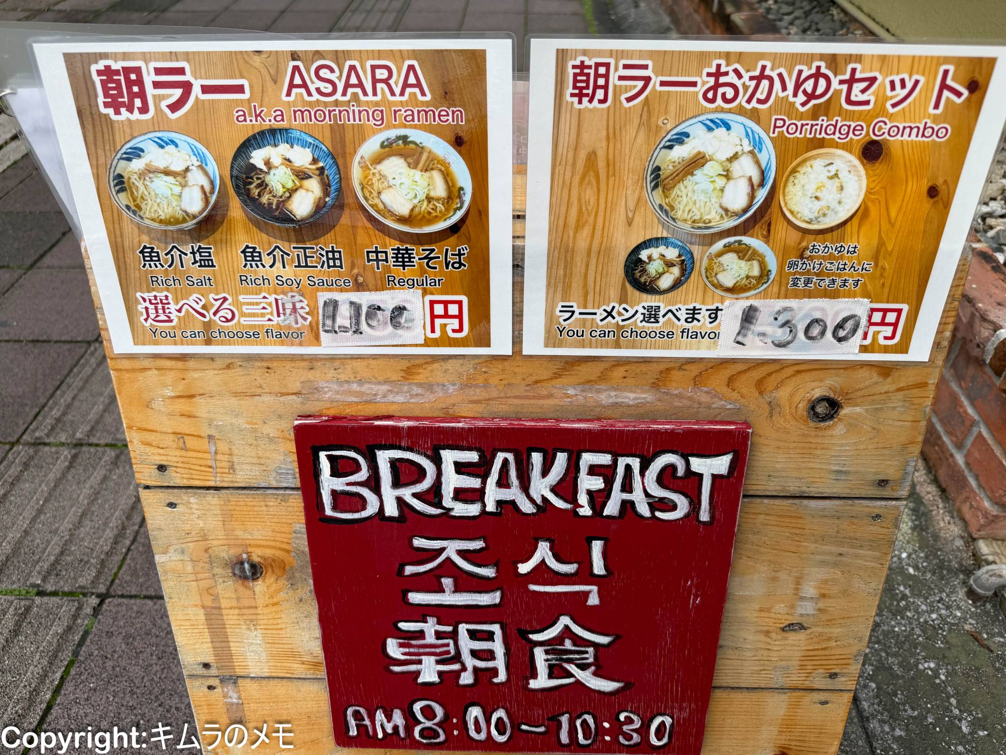 店舗の前には朝時間限定の「朝ラー」の看板が置かれているので、この看板でラーメン店であることがわかる。