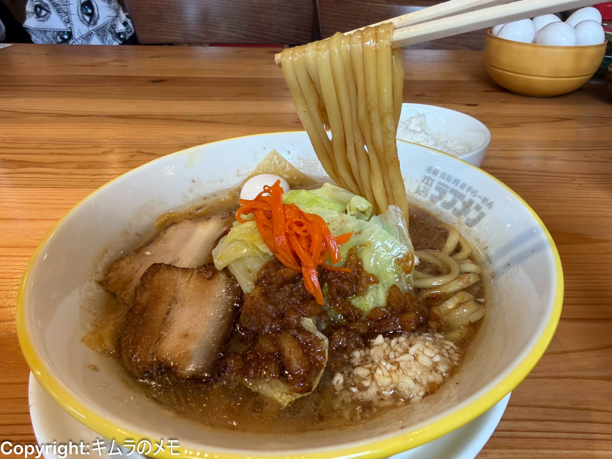 油の層がはっきりと見える濃厚なスープの中には麺線が整えられた麺が沈んでおり、その上にはキャベツやニンジン、うずらの卵やチャーシュー、ワンタンの皮、そしてニンニクがトッピングされている。